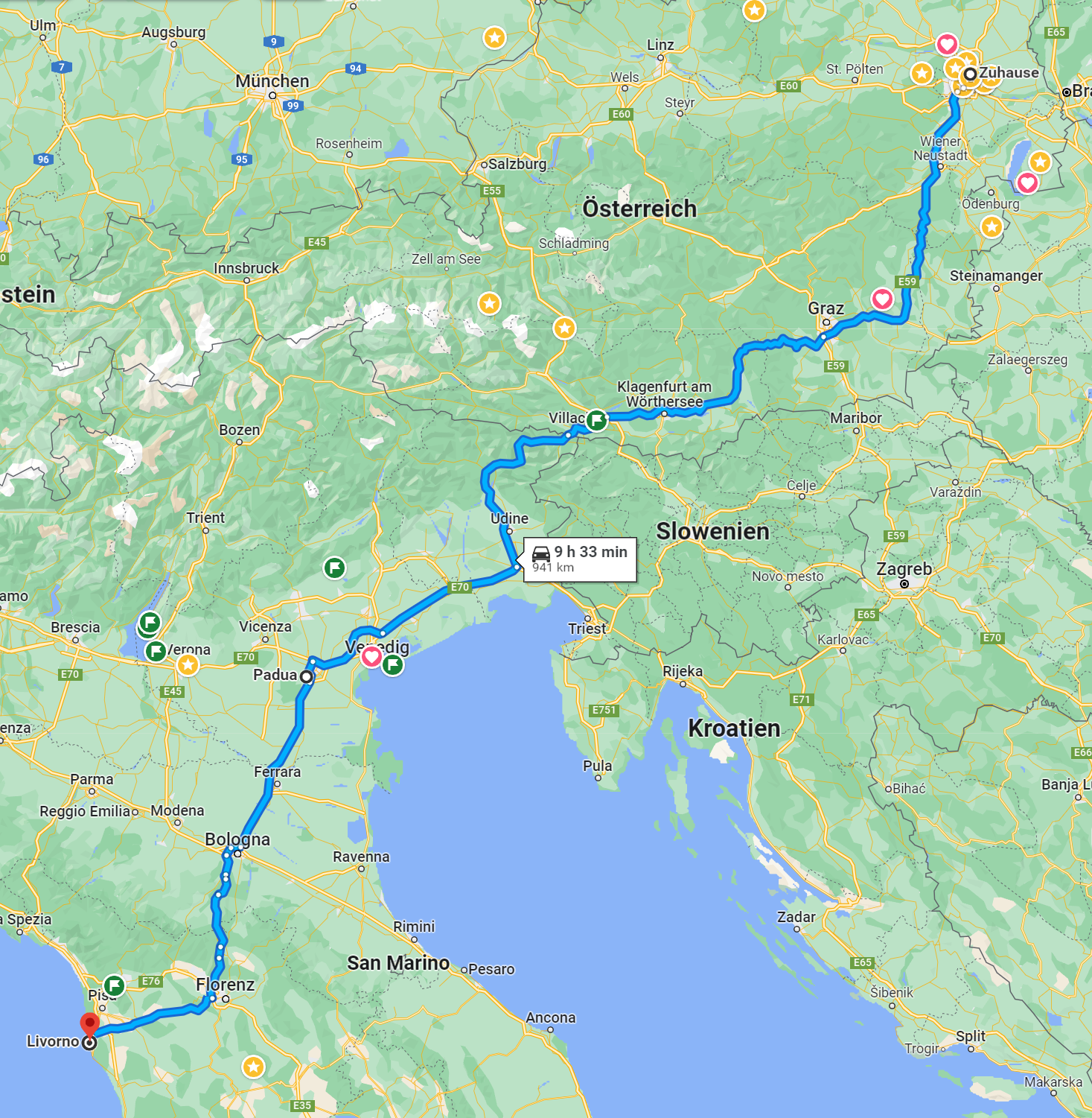 Erster Zwischenstopp ist in Padua geplant, dann geht es weiter in Richtung Livorno zur Fähre nach Sizilien
