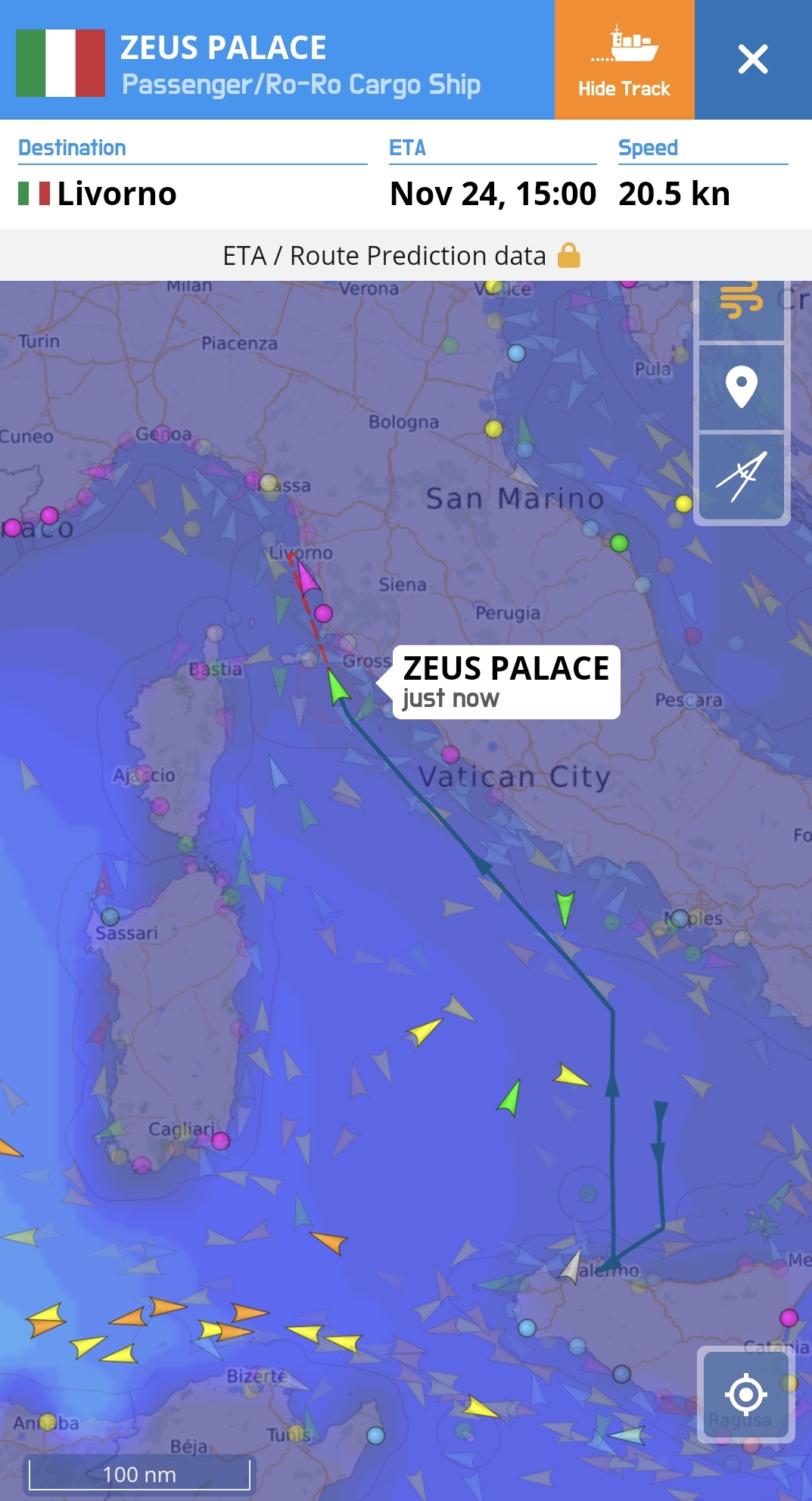 Da wir gestern erst mit fast 2 Std. Verspätung ablegten, werden wir auch in Livorno mit der Verspätung ankommen, da wir eine etwas längere Route als üblich fahren.