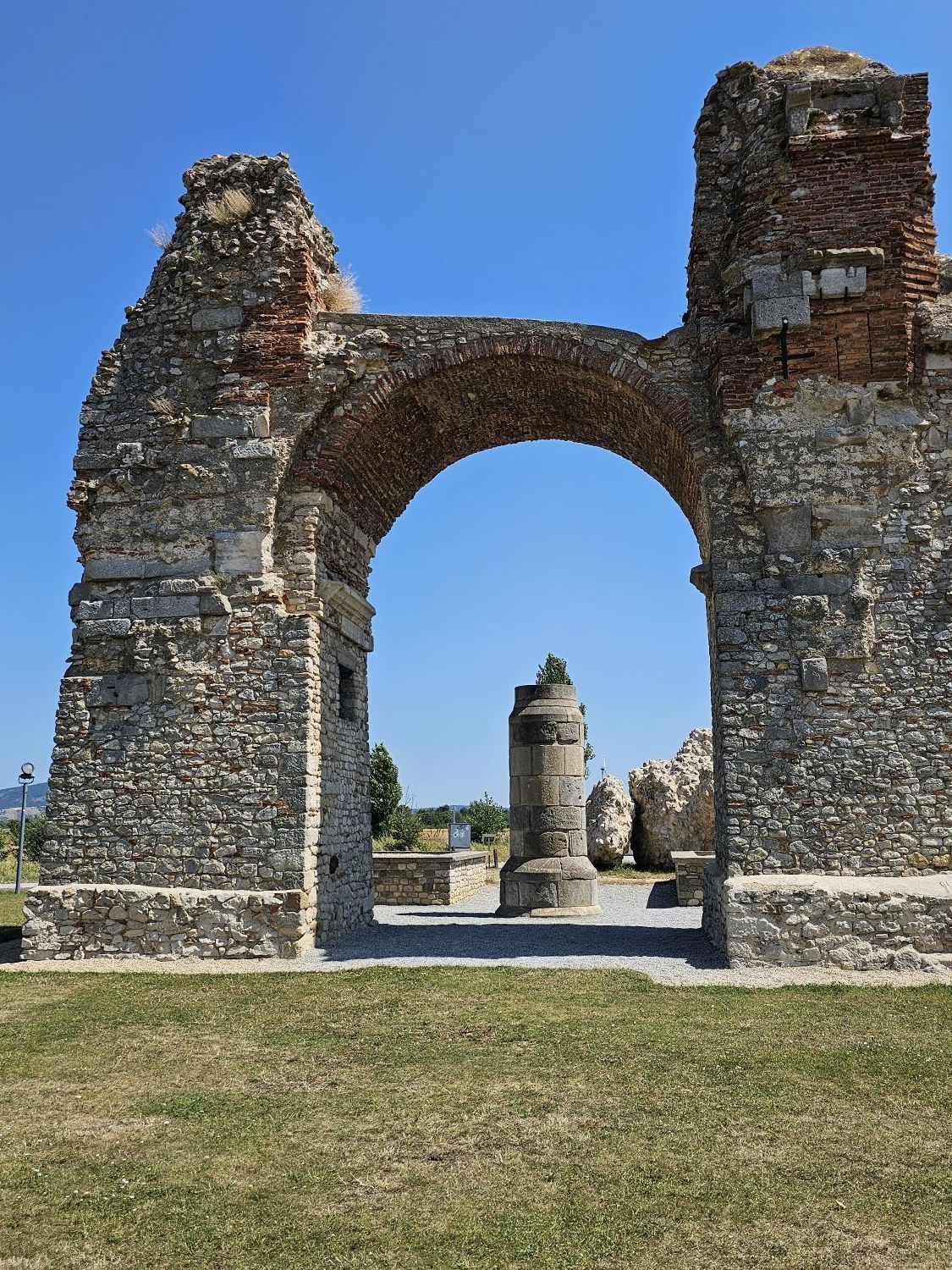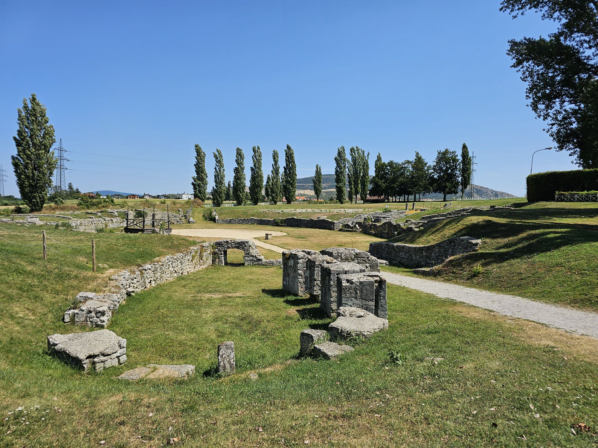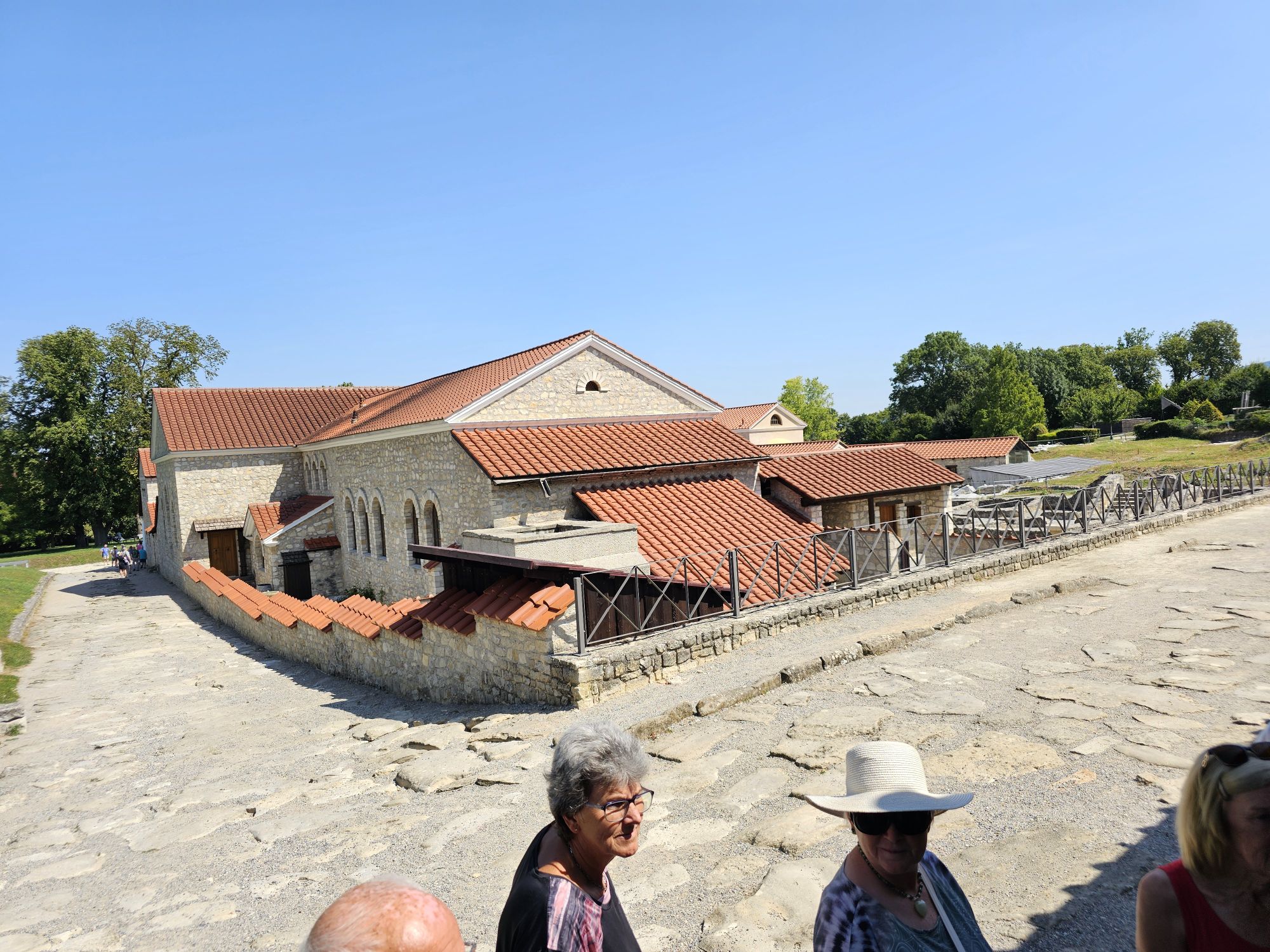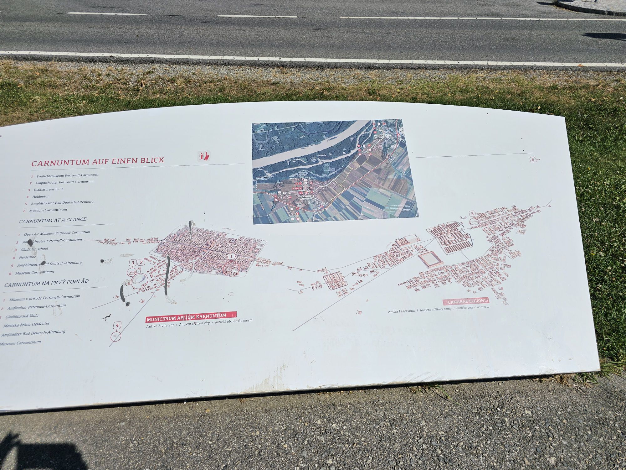 eine riesige Römersiedlung mit rund 50000 Einwohnern von 8 bis 433 n. ChrDie gesamte Anlagebestehend aus der zivilen-und der MilitäranlageBeim Ölhändler gab es Olivenöl aus dem ganzen Mittelmeerraum Spanien, Italien, Griechenland und Kroatien, an Hand der Beschriftung auf den Amphoren nachvollziehbar.das Lager des ÖlhändlersDas Haus eines wohlhabenden HändlersEine der vielen öffentlichen Bedürfnisanstalten, in denen im wahrsten Sinne des Wortes Geschäfte gemacht (abgeschlossen) wurdendie erste Halle einer privaten Therme mit „orginaler“ Fußbodenheizung. die noch in Betrieb istKaltes Becken2. Thermenhalle etwas wärmerUnd hier das Becken in der 3. Halle – hier hatte der Boden ca. 50 °C daher mussten Holzsandalen getragen werden.Dann ging es weiter in den privaten Bereich mit einem beeindruckenden Speisesaalmit toller Wandmalereidie Küche mit funktionsfähigem Ofender „Arbeitsraum“ des HändlersIn einer zweiten Villa, hier ist das Bodenmosaik noch erhaltenDann ging es weiter in das ehemalige AmphiteatherUnd als Abschluss noch zum Heidentor