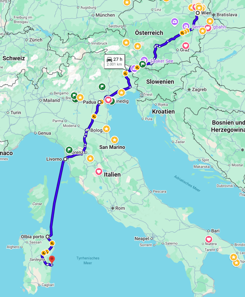Am 25 Dezmeber ging es los Richtung Sardinien, die erste Etappe ging bis Padua und am nächsten Tag weiter nach Livorno zur Fähre. Mit der Fähre erfolgte die überfahrt nach Olbia und weiter zu unserem Campinpngplatz (Camping Telis) in Arbatax.